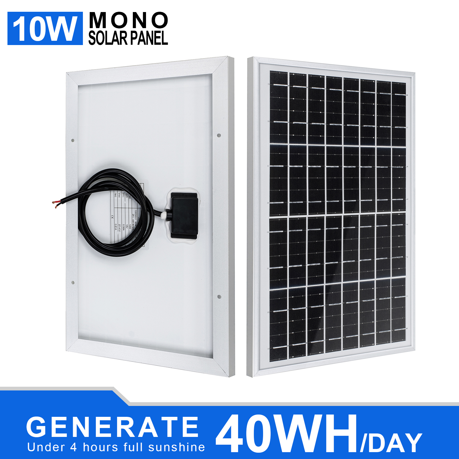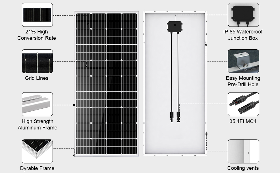 ECO-WORTHY this 100W 12V Monocrystalline Solar Panel is primarily used on off-grid situations that include RV, boat, sailboat, yacht, truck, cabin, camper, tent, trailer, golf cart. Each solar panel comes with a pair of 35 inches cables. By-pass diodes are pre-installed in waterproof IP-65 rated junction box to minimize power drop caused by shade and ensure excellent performance in low-light environments. Withstand high wind (2400Pa) and snow loads (5400Pa), the surface is made up of 3.2mm low Iron glass, the monocrystalline modules are framed by 35mm width aluminum alloy, which is 2~5mm wider than the other's.