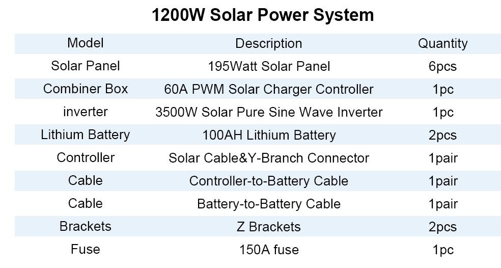 This 1200W solar panel complete system generates about 5KWh per day under 4 hours full sunlight condition, very suitable for home, shed, cabin, RV or other energy backpack, and it provides enough power for air condition, TV, refrigerator, coffee maker, microwave and other AC 110V devices.