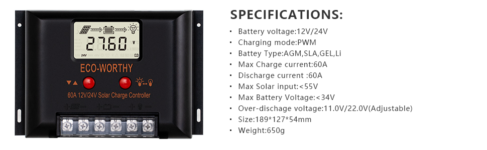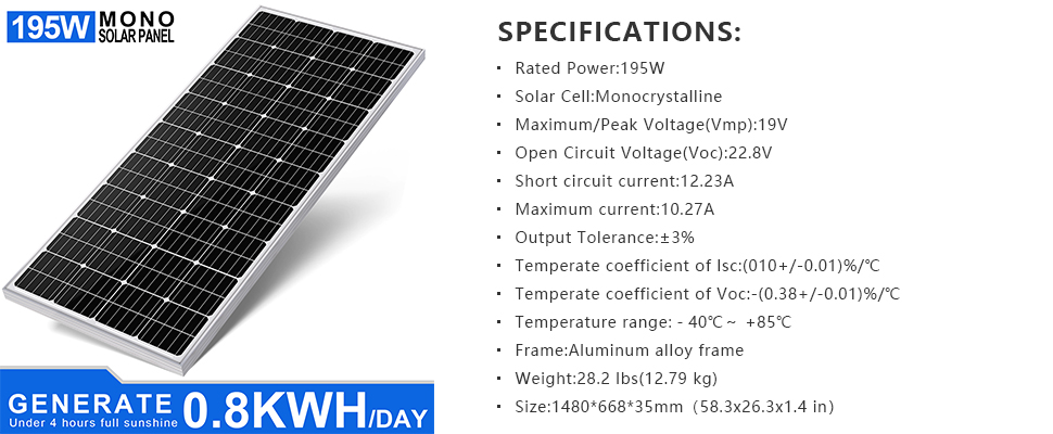 ECO-WORTHY monocrystalline solar panel is compact with enhanced aluminum frame and tempered glass. The size is 58.3*26.2*1.4 inches. IP66 class ingress-proof, strong enough to withstand strong winds (2400Pa) and snow loads (5400Pa), worry-free for outdoor uses.