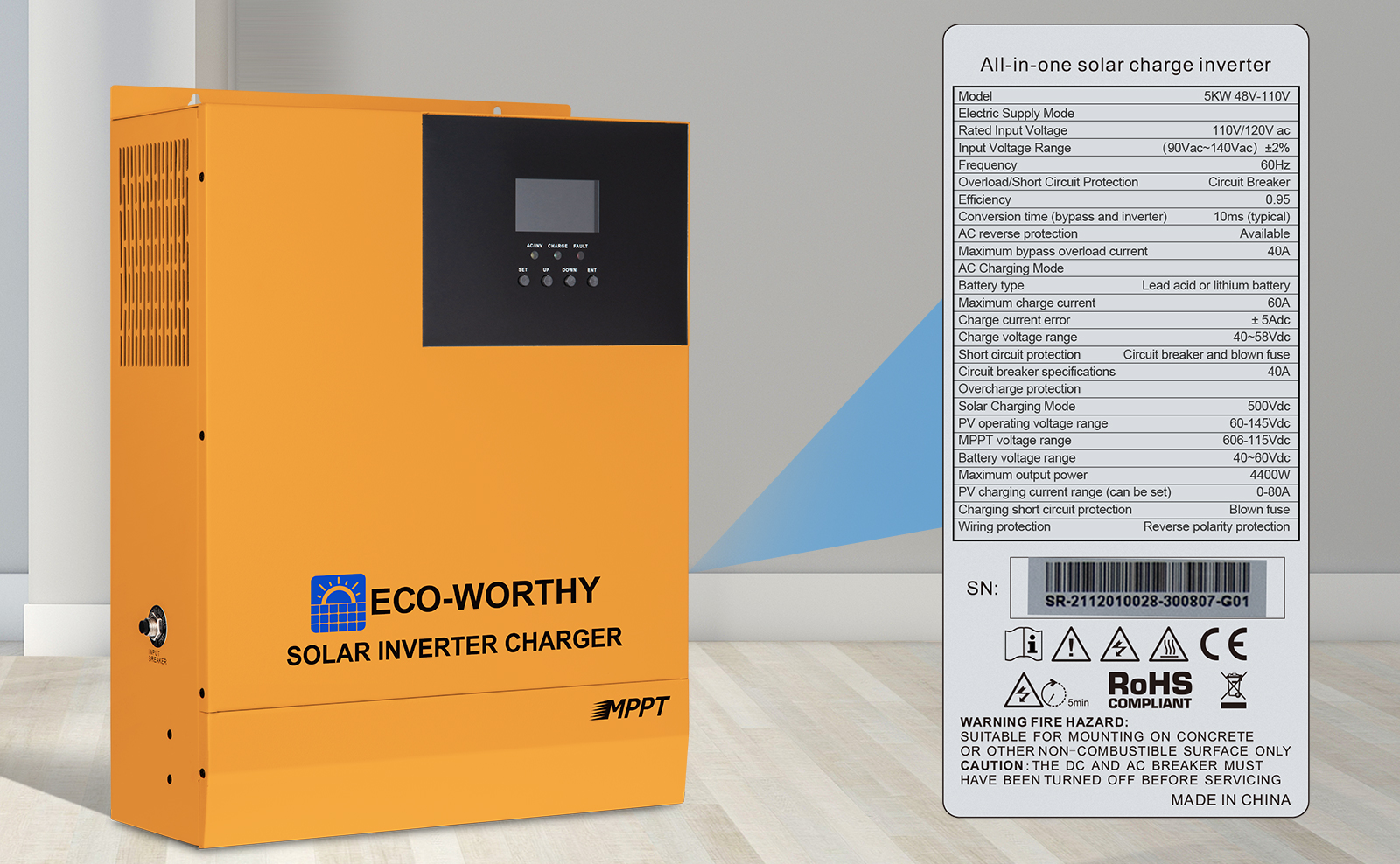 ECO-WORTHY All-in-one Inverter is a new hybrid solar energy storage inverter control all-in-one machine integrating solar energy storage and commercial power charging energy storage and AC sine wave output. It adopts DSP control and has advanced response algorithms and high reliability through advanced control algorithms. And high industrialization standards. There are only four charging modes: solar power, city power priority, solar power priority, city power and solar power. Three output modes: Solar power priority mode, Grid power priority mode, Inverter priority mode, are available to meet different application needs.