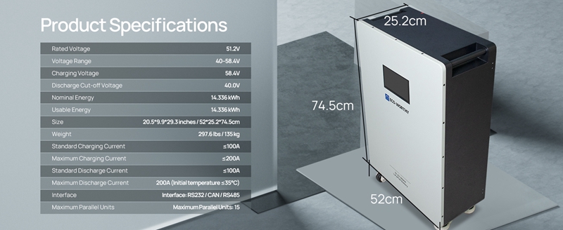 Large Capacity: 16 pieces of 280Ah high-quality Grade-A cells are connected in series, one battery can store 14.336kWh of electricity, and up to 15 batteries can be connected in parallel. Convenient Monitoring: This battery features an upgraded, larger display that clearly shows key information, including the capacity, voltage, current, temperature, and cell status of both the master and slave batteries, built-in communication interface supports connection to the host computer or inverter for communication. Dual Protection: The built-in 200A PACE BMS offers intelligent protection with high/low temperature, overcurrent, and overvoltage protection. A 250A circuit breaker with an integrated shunt trip unit ensures quick disconnection of battery input and output in case of emergencies, ensuring electrical safety. Thoughtful Installation Design:The upgraded battery features detachable terminals for easy installation and flexible expansion. It is also equipped with four durable Footmaster Nylon wheels and L-shaped brackets, allowing for effortless mobility while ensuring secure fixation in a specific position. Extremely Long Life: Designed for long-term use, the battery cell has a DOD of more than 80% after 10,000 cycles, providing you with a service life of more than ten years.