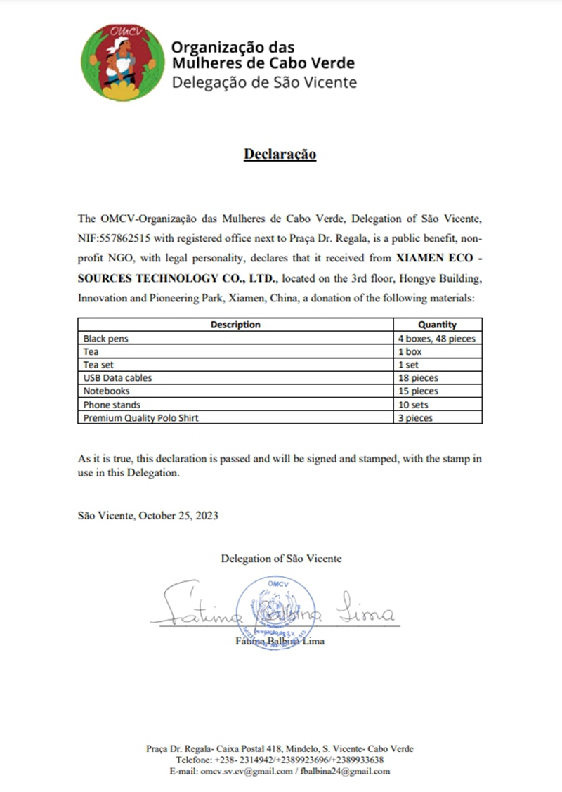 The gifts we are donating are designed to help the women improve their quality of life and self-esteem. The gifts include black pens, tea leaves, tea sets, USB cables, notebooks, cell phone holders and quality polo shirts. These gifts represent XIAMEN ECO-SOURCES TECHNOLOGY CO., LTD.'s contribution to Cape Verdean women's organizations and hopefully bring them some convenience and happiness. We are confident that these gifts will have a positive impact on the women of Cape Verde, allowing them to feel the warmth and support of the community.