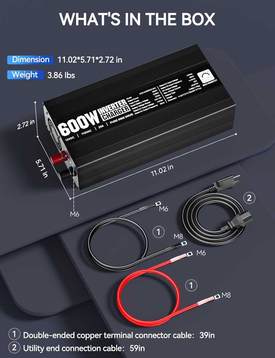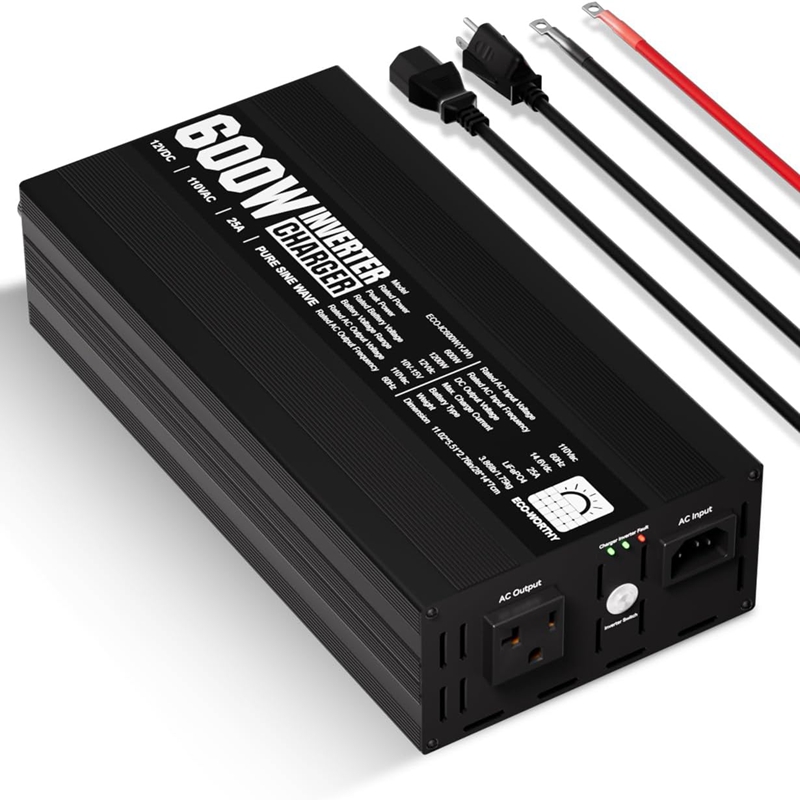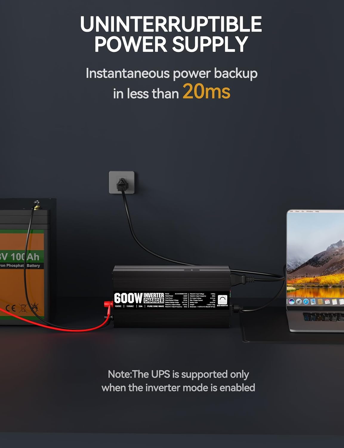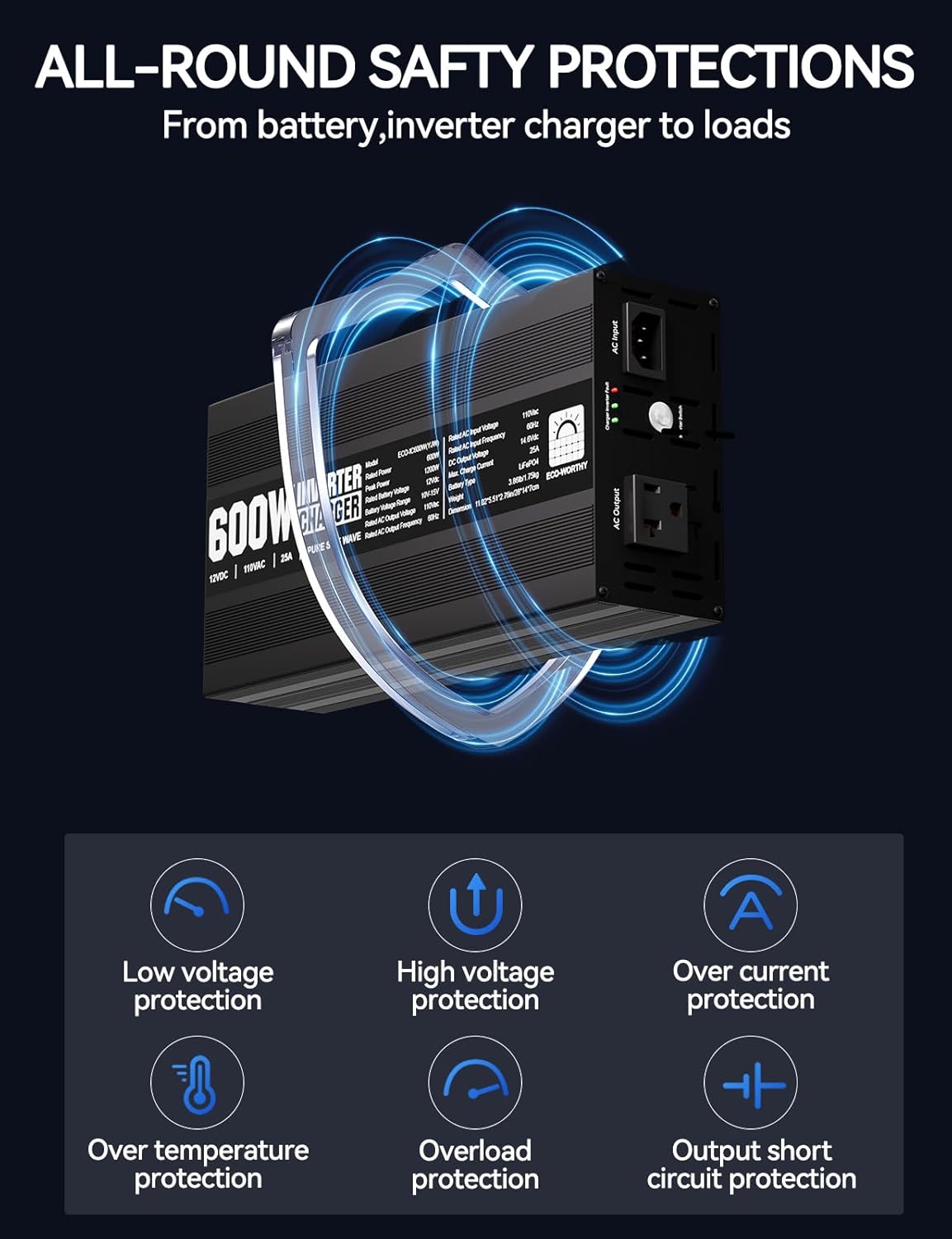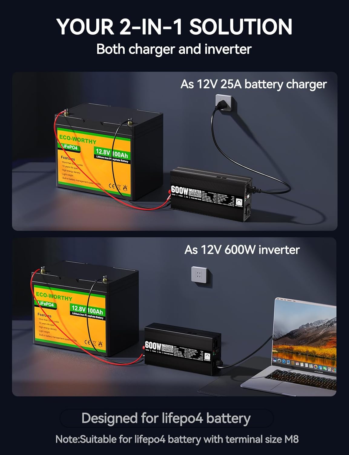 • Lifepo4 Charger with Inverter Function: ECO-WORTHY 25A battery charger provides full-speed charging for 12V Lifepo4 battery;Features 600W inverter output function, peak power of 1200W, conversion efficiency of over 90%, easy to drive daily electrical appliances such as microwave ovens, computers, etc