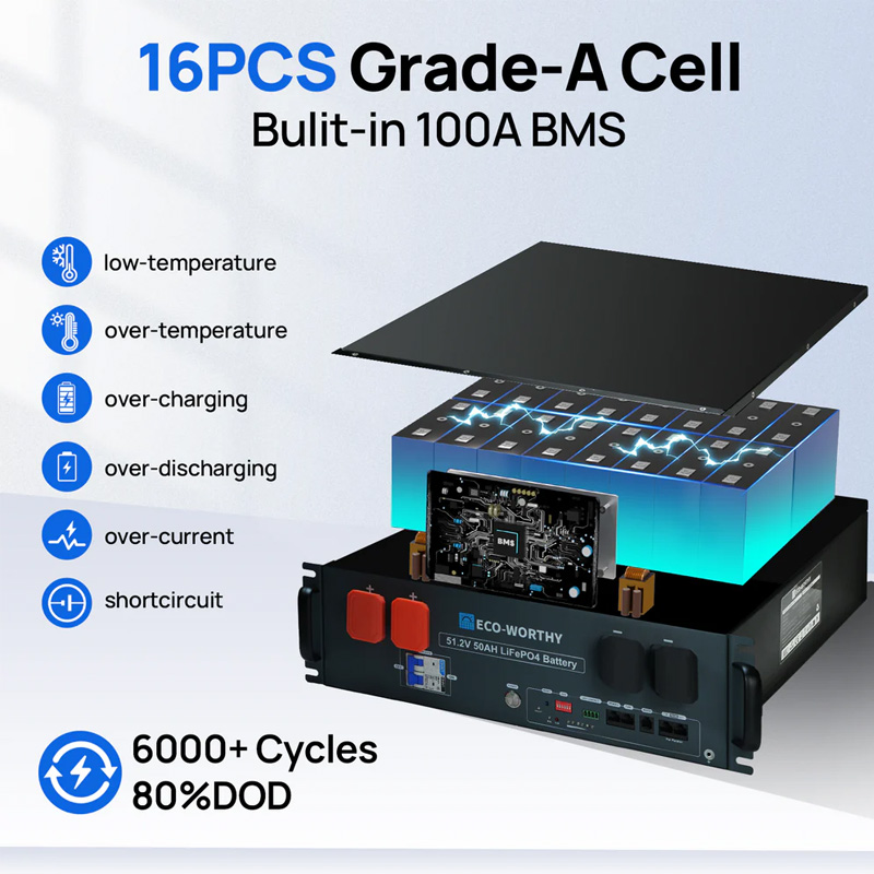 ECO-WORTHY 51.2V 100Ah Server Rack Battery With Bluetooth & Wifi 3U Size 5.12kWh Capacity 10-Year Warranty: Powered by premium Grade A cells, this battery offers exceptional consistency and long-lasting performance. Backed by a 10-year after-sales support, you can trust in the quality and reliability of this battery for years to comeSmart Monitoring: Supports CAN/RS485 for seamless communication with popular all-in-one solar inverters.You can easily monitor your battery’s status through the mobile app, which supports both Bluetooth and WiFi connections. Stay informed on your battery’s health and performance in real-timeSpace-Saving Design: Easily integrates into standard 3U racks for efficient space use. Its manageable 95 lb weight allows for single-person installation, with support for up to 15 parallel connections.Robust Safety Features: Durable full metal casing, integrated 100A BMS with comprehensive protection (overcharge, over-discharge, over-current, short circuit, and over-temperature), plus a 125A air switch and power switch for added safety.Complete and Ready to Use: This battery comes fully equipped with all necessary accessories, including parallel wires, communication cables, grounding wires, protective terminal covers, terminal screws, and a user manual, ensuring you’re ready to go straight out of the box.