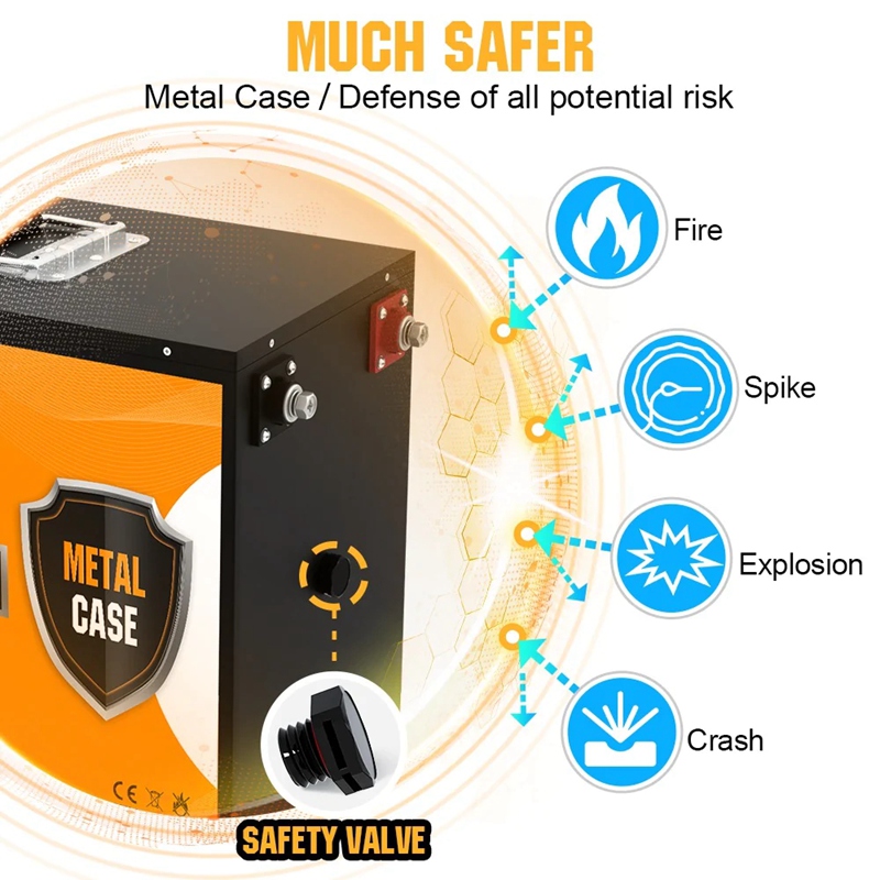 ·Safer Metal Shell Design: Explosion valve and metal steel shell design protect it from fire and explosion. And it has a more stable built-in 120A BMS to protect it from overcharge, over-discharge, charge over-current, discharge over-current, short-circuit, cell voltage self balance, high-temp discharge cut off.