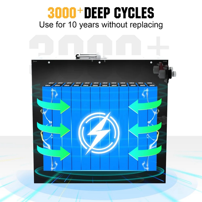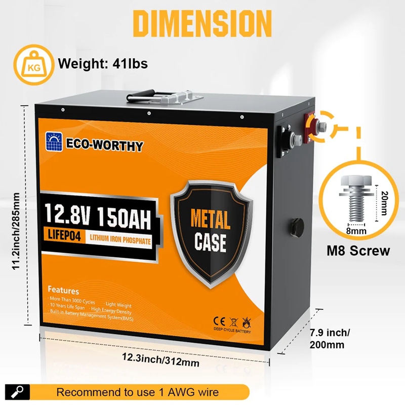 ·10-year Life & 3000+Deep Cycles: ECO-WORTHY's 150ah LiFePO4 Lithium Battery contains 3000+ deep cycles, each lithium battery can run for more than 10 years, which is 3 times longer cycles than other AGM batteries on the market.And our lithium-iron batteries can maintain 80% capacity after 3000 deep cycles.·Safer Metal Shell Design: Explosion valve and metal steel shell design protect it from fire and explosion. And it has a more stable built-in 120A BMS to protect it from overcharge, over-discharge, charge over-current, discharge over-current, short-circuit, cell voltage self balance, high-temp discharge cut off.·Lighter but More Power: Our LiFePO4 Battery has compact size design, which makes it smaller in size and 1/3 the weight of the lead acid battery at the same capacity, much more convenient for you to remove and place it.·Application: The150Ah Lithium Iron Phosphate Battery has 1920Wh Energy, and can be expanded to 30.7kwh by wired in 4S4P, Perfect for trolling motor, RV, campers, marine, travel trailer, solar power system, motor homes, UPS, off-grid etc.·US Warehouse & Fast Delivery: 3-5 Days fast delivery for US mainlands, we ship the battery from our local warehouse in California. Our online services with quick feedback within 24 hours, if you have any questions, please feel free to contact us, we will do our best to meet your needs.