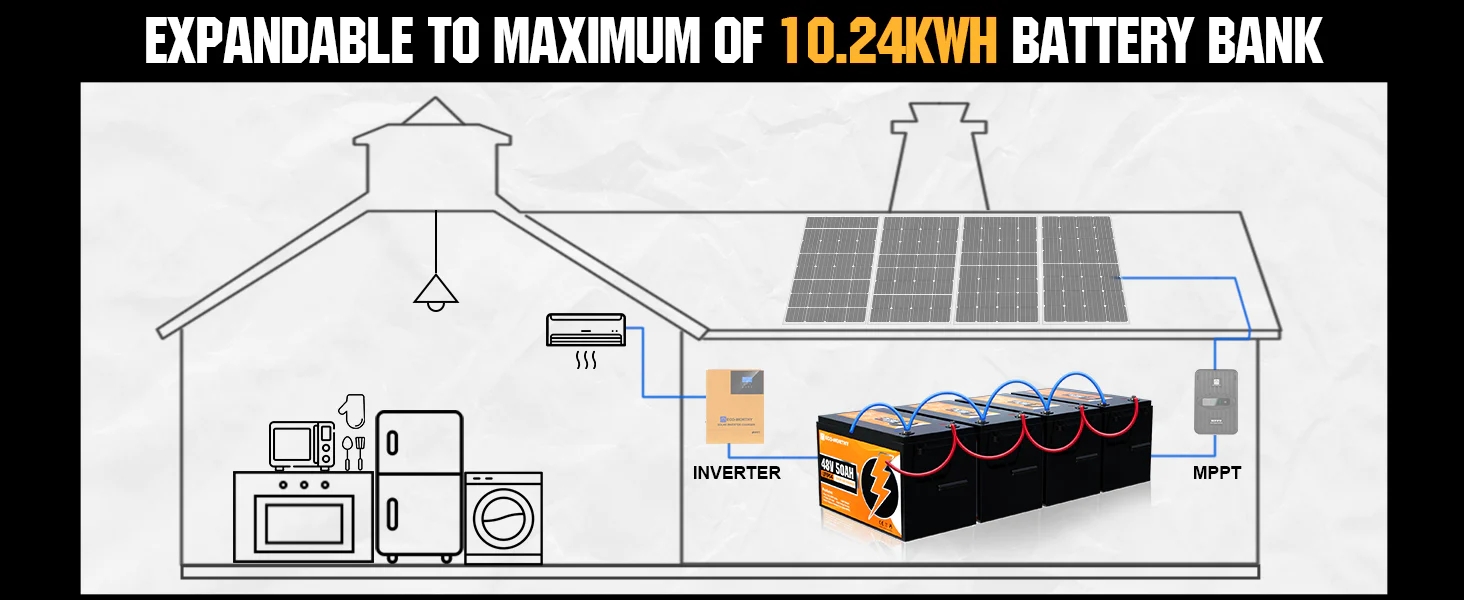 ECO-WORTHY LiFePO4 48V Lithium Iron Phosphate Battery has twice the power, half the weight, and lasts 8 times longer than a sealed lead acid battery, no maintenance, extremely safe and very low toxicity for environment. Our line of LiFePO4 offer a solution to demanding applications that require a lighter weight, longer life and higher capacity battery.