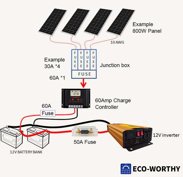 With a Pulse Width Modulated (PWN) charge controller, the worst-case amps flowing to and from the controller are the same, so the fuse and wire size can match. As an example, We recommend a 60-amp fuse/breaker for the 60A PWM charge controller, put it between the unit and the battery bank.